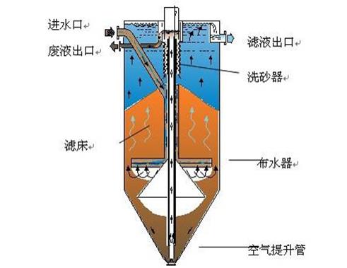活性砂過濾器基于逆流原理,需處理的水通過位于設備底部的入流分配管進入系統(tǒng),經活性砂過濾后由頂部出流口流出。需處理的水向上流經濾床時被清洗,含有處理雜質的活性砂從設備的錐形底部通過空氣提升泵被運送到頂部的清洗器,通過紊流作用使臟顆粒從活性砂中分離出來,雜質通過清洗水出口排出,凈砂利用自重返回砂床。